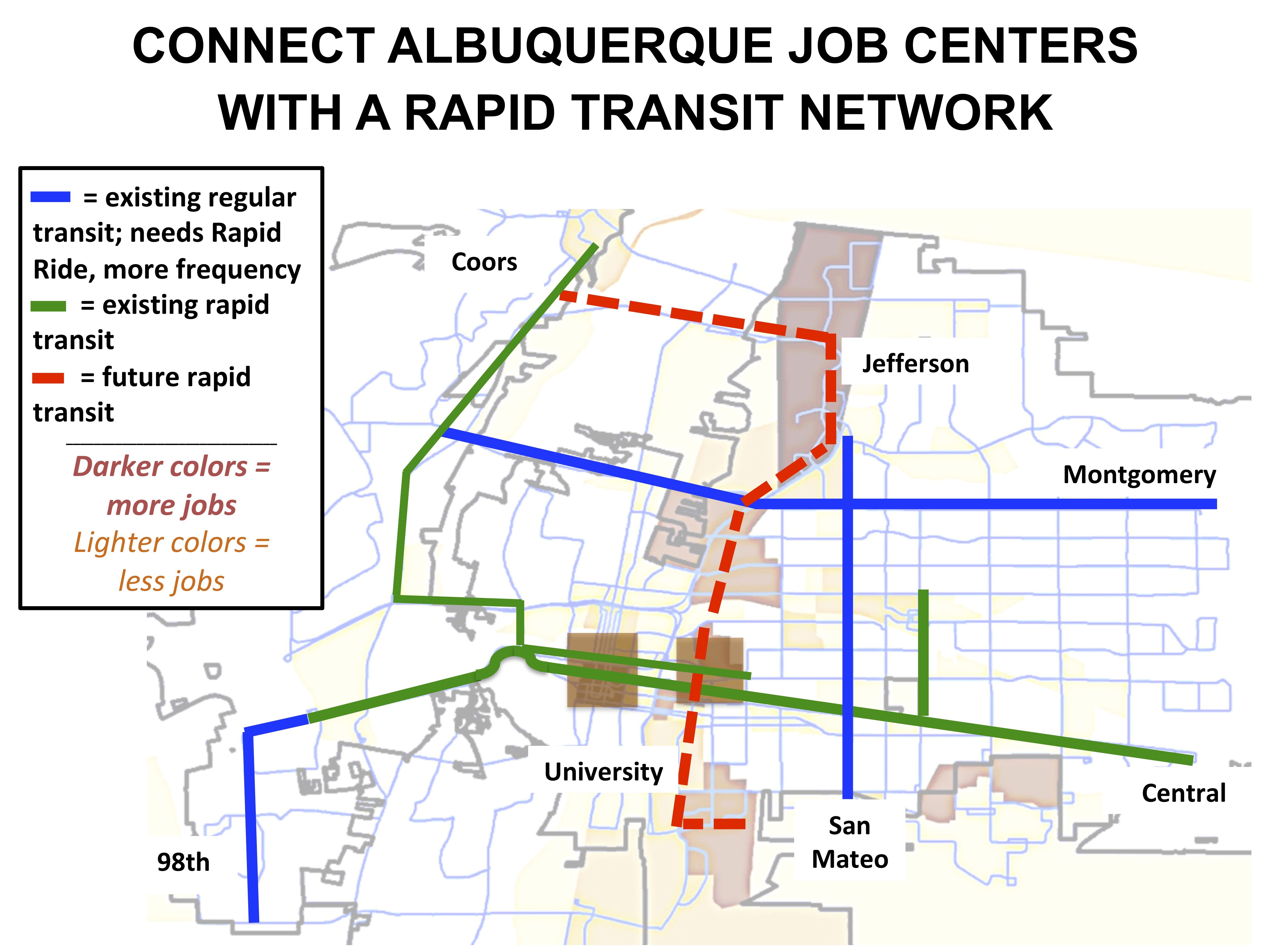 Transit systems should, fundamentally, increase access to the city for the people within it. There are many ways to increase access to services, one of which is changing land use, something our recently updated zoning code and comprehensive plan attempts to address. However, changing land use takes a long time. If we want to quickly connect more people in Albuquerque to more opportunities, creating a transit network is essential. Of course, there are many other major benefits to creating a transit network, including a fast track towards cleaner air and less pollution.