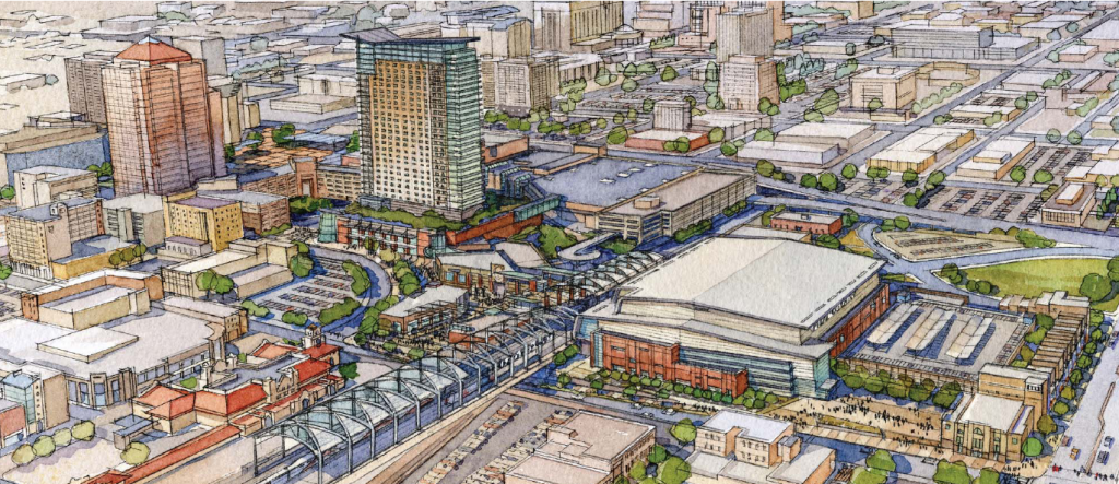 An illustrative vision of Downtown Albuquerque. Note an indoor stadium on the Innovate ABQ site, as well as high-rise development adjacent to the Convention Center.