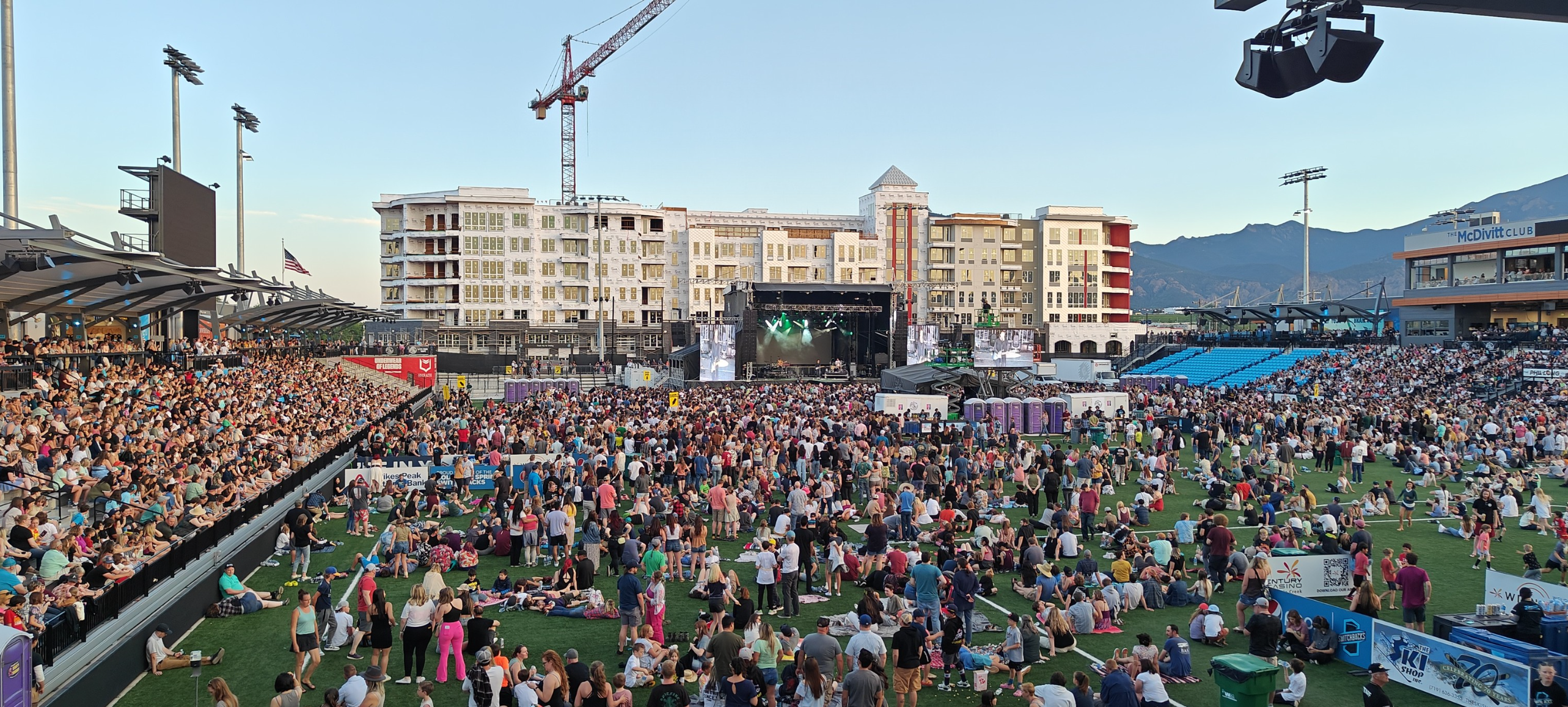The recently completed Weidner Field multi-use stadium in Downtown Colorado Springs, Colorado, is shown here during a concert with development in the background.