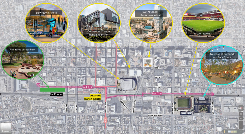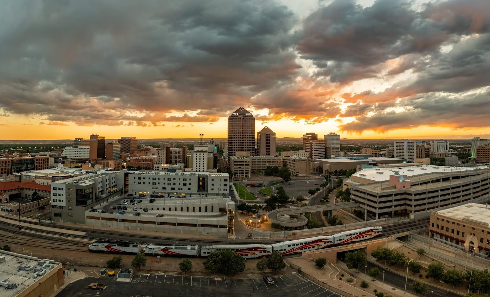 A view of Downtown Albuquerque looking west, feat. the Rail Runner, One Central, the Convention Center, and other assets/destinations. Image source: Ben Bunner