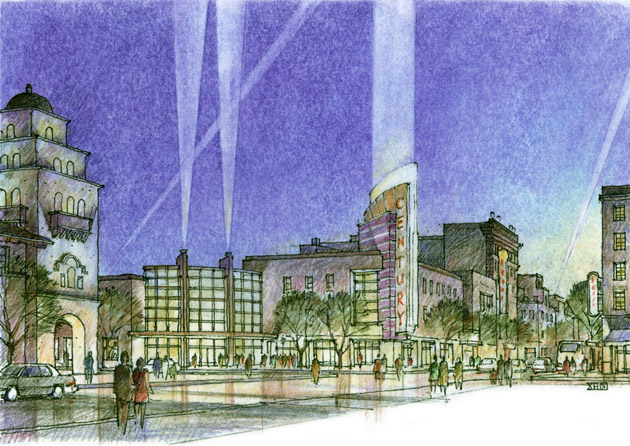 An illustrative graphic of Downtown ABQ, feat. the Theater Block.