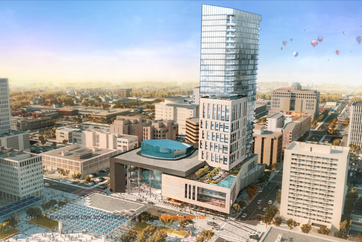 I dropped in the footprint from my favorite Civic North RFP response, Reunion Center, which proposed a 2,500-seat theater, a black box theater, a 220-room hotel, over ten thousand square feet of retail, and 117 residences in a stunning tower. The city lacks a theater like this (the nearly 60-year-old Popejoy Hall is smaller and can only host so much) and we have heard for years that downtown needs more hotel rooms to compete for bigger conventions. Seems like a win-win. Does anyone know why Keller canceled this RPF?