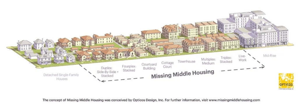 A graphic illustrating examples of missing middle housing from Opticos Design.