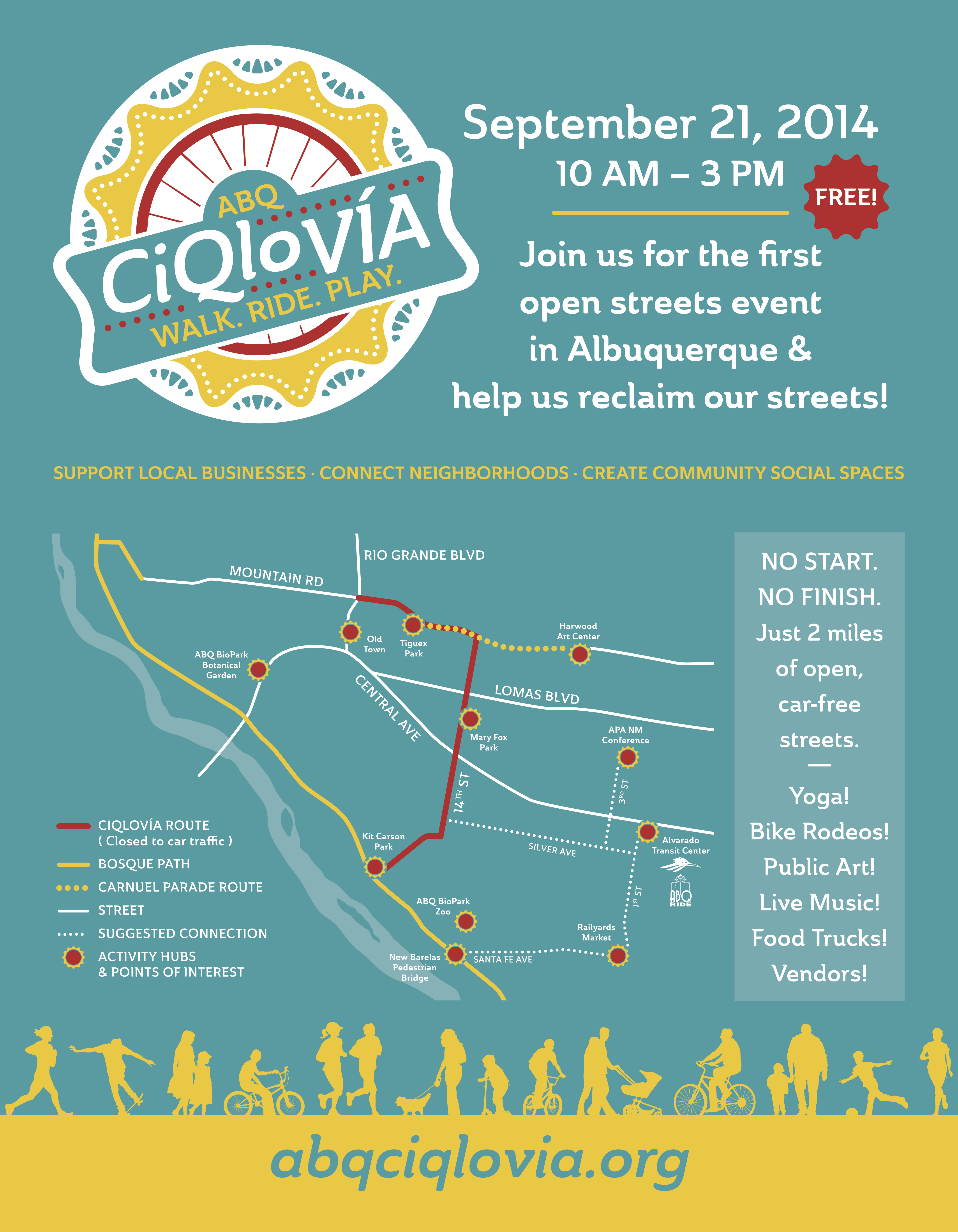 Today in Albuquerque, few people choose to walk or bike for transportation because our streets are scary and dangerous. Communities across America are realizing the value of safe walking and biking but here in Albuquerque, progressive policies around these ideas have stagnated. We hope to bring new energy to this important movement through fun events such as ABQ CiQlovía.