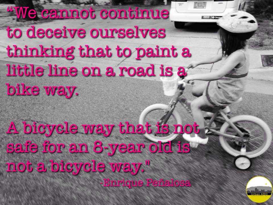 It is time for Albuquerque to return to the top when it comes to cycling. Our trail system is great but we’re falling behind when it comes to on-street facilities. We must make it clear what we want and why and it will take a collective effort. Please join us! We will close with this quote from urbanist Enrique Peñolosa: