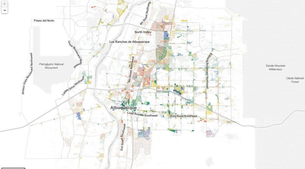 We can also see how our work lives are being affected by development related decisions (like zoning codes). There is a lot of separation of uses in Albuquerque. There are also a lot of areas of Albuquerque where there are no jobs. This is economically isolating and doesn’t promote a lot of principles that are important to the vitality of cities, like walkability, bike-ability and neighborhood diversity. Neighborhoods with jobs and a mix of land uses have a larger diversity and more vitality in the economy.