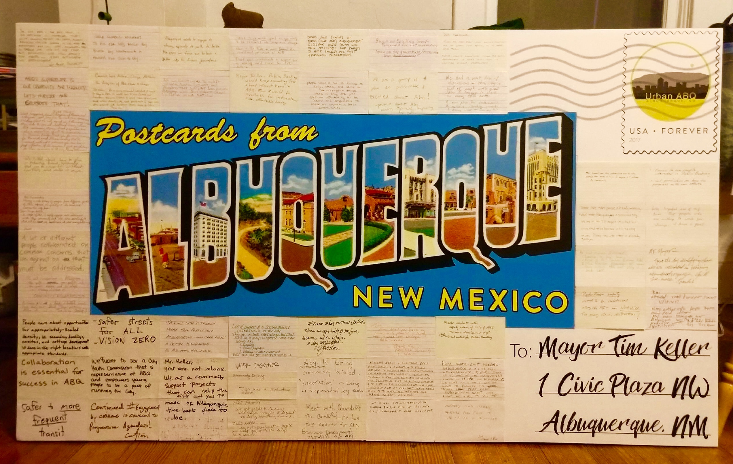 Besides our regularly scheduled meeting on Thursday, January 25th, join us at City Hall on Monday, Jan 29th at 4 PM to present a giant postcard to mayor Tim Keller! This postcard contains messages to the mayor from the people who attended the Citywide Summit on Saturday, Nov 18th. It will be a chance to engage the new administration around the issues we as group care most about.
